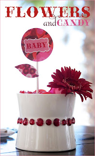 - Oculta la espuma floral y los bordes con una capa de dulces. (En este caso se han usado ruedas rojas y bolas de chicle rojo en este baby shower.)